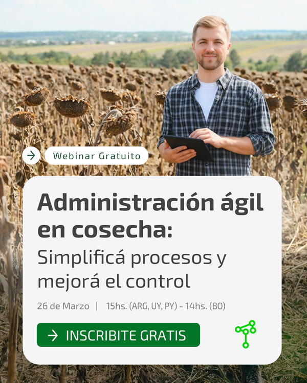 En este contexto, el jueves 26 de marzo a las 15:00 (hora de Argentina, Uruguay y Paraguay) y 14:00 (hora de Bolivia) se realizará el webinar virtual “Administración ágil en cosecha: simplificá procesos y mejorá el control”, un encuentro online en el que se presentarán herramientas para optimizar la gestión administrativa durante uno de los momentos más intensos de la campaña.