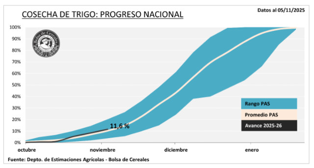 Con un progreso intersemanal de 3,2 p.p., la cosecha avanzó sobre el 11,6 % del área apta. El rinde promedio asciende a 24,3 qq/Ha, manteniendo la proyección de producción en 22 MTn.