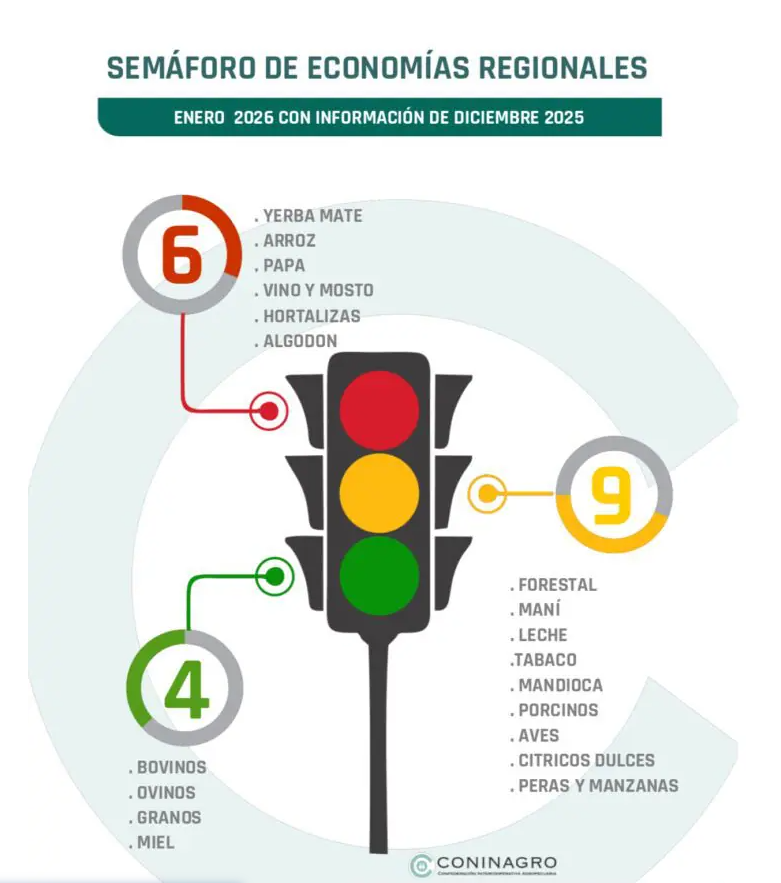 Sólo cuatro actividades de las Economías Regionales finalizaron 2025 en verde, mientas que nueve quedaron en amarillo y seis en rojo, de acuerdo con los datos relevados por el Semáforo de Coninagro, que prepara el Departamento de Economía.