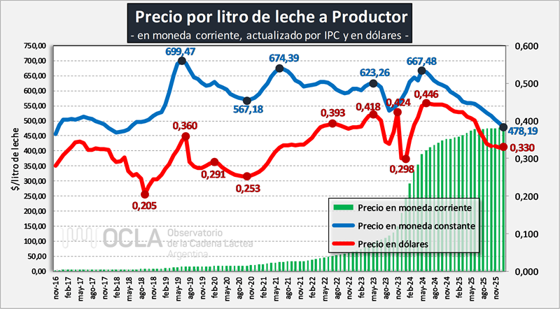 Así, el informe sobre precios pagados a los productores por litro de leche, publicado por el Ocla en base solamente al Siglea, arrojó que, una vez ajustado por la inflación, el valor del litro en enero de 2026 es el más bajo de los últimos 8 años para ese mes.