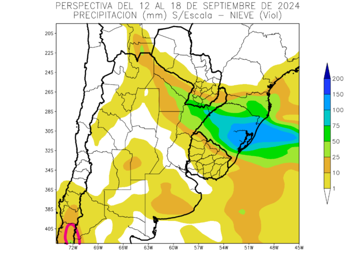 Al inicio de la perspectiva agroclimática para la semana del 11 al 18 de septiembre en Argentina, se completó el paso de un frente de Pampero, produciendo precipitaciones escasas a nulas en la mayor parte del área agrícola, salvo focos con registros moderados a abundantes sobre el este del Paraguay y el norte de la Mesopotamia, mientras la Cordillera Sur y Central recibirán nevadas (señaladas en rojo obscuro).