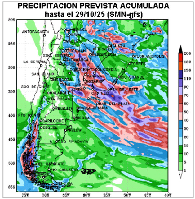En las últimas simulaciones que ofrecen los modelos matemáticos de la situación meteorológica para los próximos días, aparece un beneficio pluvial significativo para buena parte de SF y ER, algo que no venía sucediendo en este mes de octubre. Son recargas que, de validarse, son muy oportunas para gran parte de este sector, el cual tiene capacidad receptiva, aunque marcas por encima de los sesenta milímetros pueden provocar excesos hídricos temporarios.